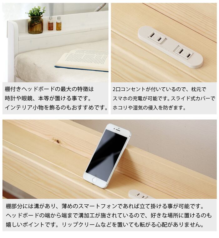 フィトンチッドと呼ばれるリラックス効果があるパイン材棚付きベッドです
