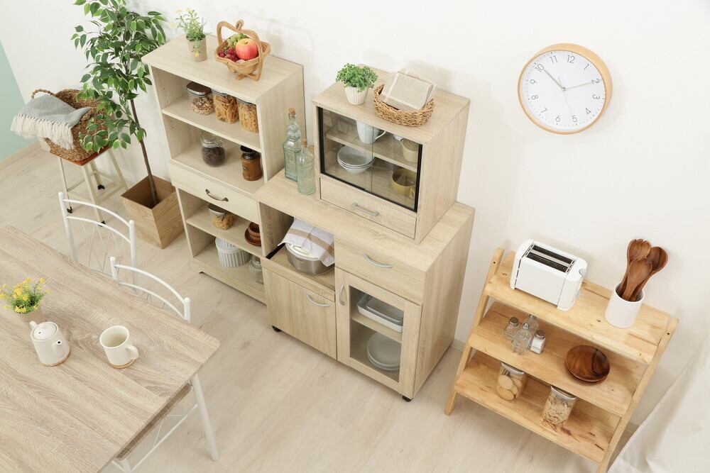 棚板は高さを調節できる可動棚で、平たいお皿から背の高いコップまで無駄なく収納できます。