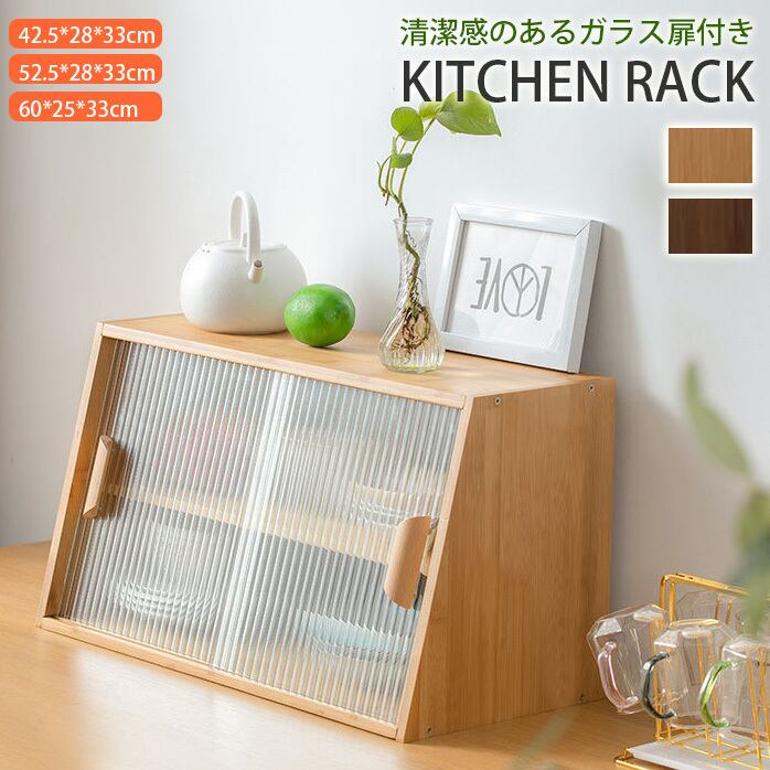 ・清潔感のあるガラス扉付きのキッチン収納ラックです。